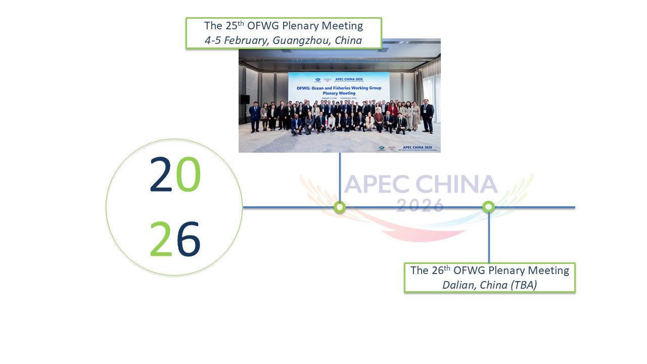 The OFWG aims to support APEC’s mission to foster sustainable economic growth, development and prosperity in the Asia-Pacific region. The vision of the OFWG is to promote sustainable fisheries and aquaculture management while ensuring ocean ecosystems remain resilient and provide economic value to support the livelihood of Asia-Pacific communities and food security in regional and global food supply chains.