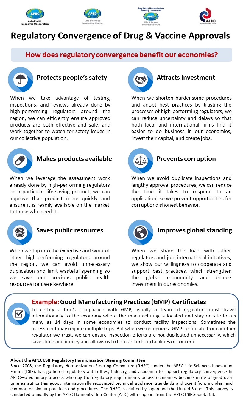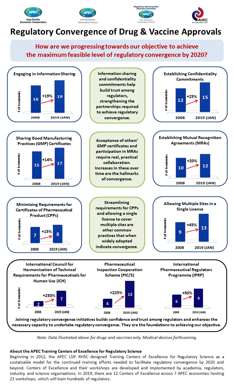 In 2009, APEC Ministers pledged to achieve convergence on approval procedures for medical products by 2020, to improve public access to life-saving innovations.